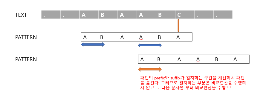 - 패턴 비교가 실패한 지점에서 suffix중 가장 긴 prefix와 일치하는 지점을 찾아내서 이것은 비교하지 않고 건너뛴다.