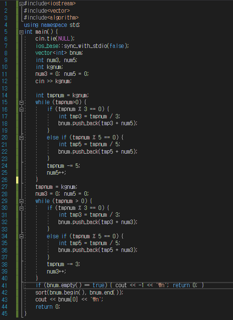 문제 상근이는 요즘 설탕공장에서 설탕을 배달하고 있다. 상근이는 지금 사탕가게에 설탕을 정확하게 N킬로그램을 배달해야 한다. 설탕공장에서 만드는 설탕은 봉지에 담겨져 있다. 봉지는 3킬로그램 봉지와 5킬로그램 봉지가 있다. 상근이는 귀찮기 때문에, 최대한 적은 봉지를 들고 가려고 한다. 예를 들어, 18킬로그램 설탕을 배달해야 할 때, 3킬로그램 봉지 6개를 가져가도 되지만, 5킬로그램 3개와 3킬로그램 1개를 배달하면, 더 적은 개수의 봉지를 배달할 수