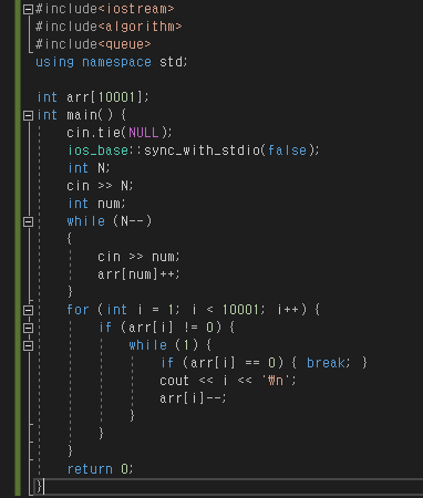 첫째 줄에 수의 개수 N(1 ≤ N ≤ 10,000,000)이 주어진다. 둘째 줄부터 N개의 줄에는 숫자가 주어진다. 이 수는 10,000보다 작거나 같은 자연수이다.