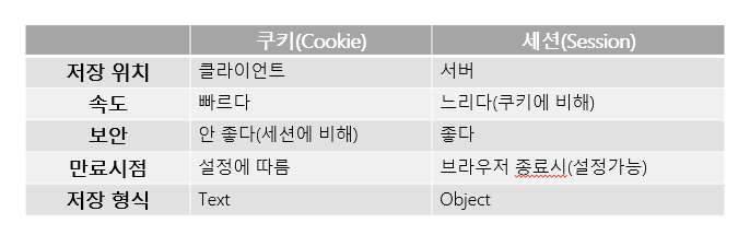 - 가장 큰 차이점은 저장위치 ( 클라이언트(쿠키), 서버(세션) )