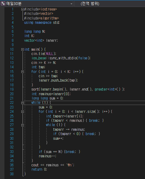 첫째 줄에는 오영식이 이미 가지고 있는 랜선의 개수 K, 그리고 필요한 랜선의 개수 N이 입력된다. K는 1이상 10,000이하의 정수이고, N은 1이상 1,000,000이하의 정수이다. 그리고 항상 K ≦ N 이다. 그 후 K줄에 걸쳐 이미 가지고 있는 각 랜선의 길이가 센티미터 단위의 정수로 입력된다. 랜선의 길이는 231-1보다 작거나 같은 자연수이다.