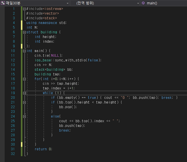 즉 약간 높은건물에 가려서 보이지 않는 다는 느낌을 떠올린다면 스택을 이용하여 풀수 있습니다.