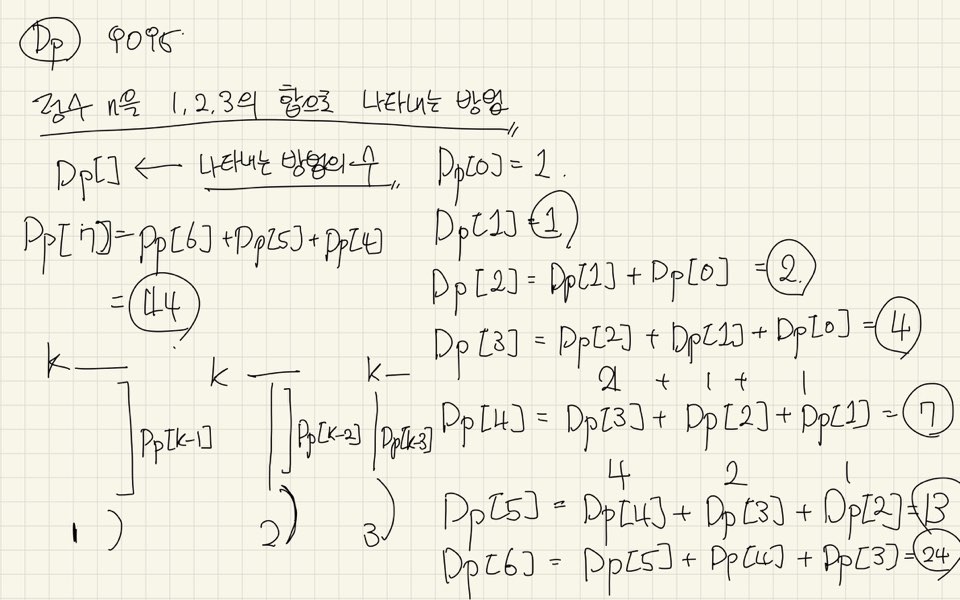 문제 정수 4를 1, 2, 3의 합으로 나타내는 방법은 총 7가지가 있다. 합을 나타낼 때는 수를 1개 이상 사용해야 한다. 1+1+1+1 1+1+2 1+2+1 2+1+1 2+2 1+3 3+1 정수 n이 주어졌을 때, n을 1, 2, 3의 합으로 나타내는 방법의 수를 구하는 프로그램을 작성하시오. 입력 첫째 줄에 테스트 케이스의 개수 T가 주어진다. 각 테스트 케이스는 한 줄로 이루어져 있고, 정수 n이 주어진다. n은 양수이며 11보다 작다. 출력 각