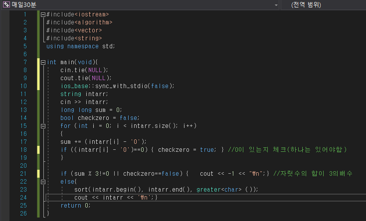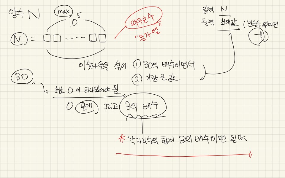 문제 어느 날, 미르코는 우연히 길거리에서 양수 N을 보았다. 미르코는 30이란 수를 존경하기 때문에, 그는 길거리에서 찾은 수에 포함된 숫자들을 섞어 30의 배수가 되는 가장 큰 수를 만들고 싶어한다. 미르코를 도와 그가 만들고 싶어하는 수를 계산하는 프로그램을 작성하라. 입력 N을 입력받는다. N는 최대 105개의 숫자로 구성되어 있으며, 0으로 시작하지 않는다. 출력 미르코가 만들고 싶어하는 수가 존재한다면 그 수를 출력하라. 그 수가 존재하지 않는