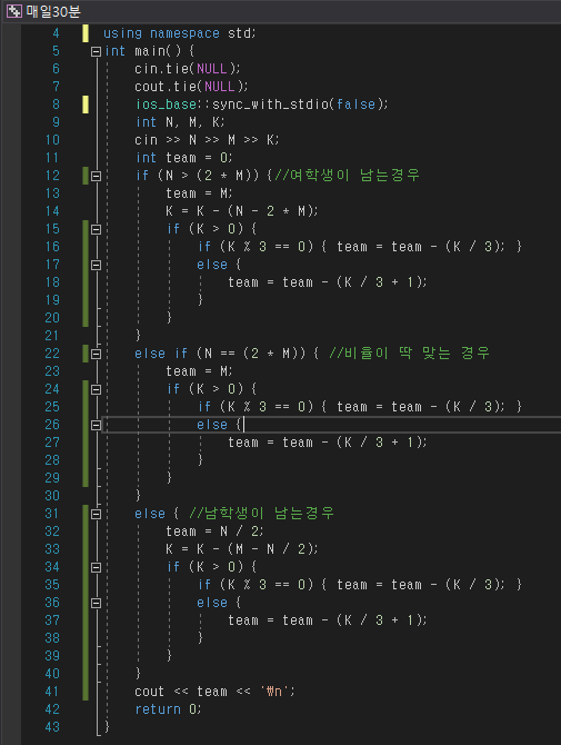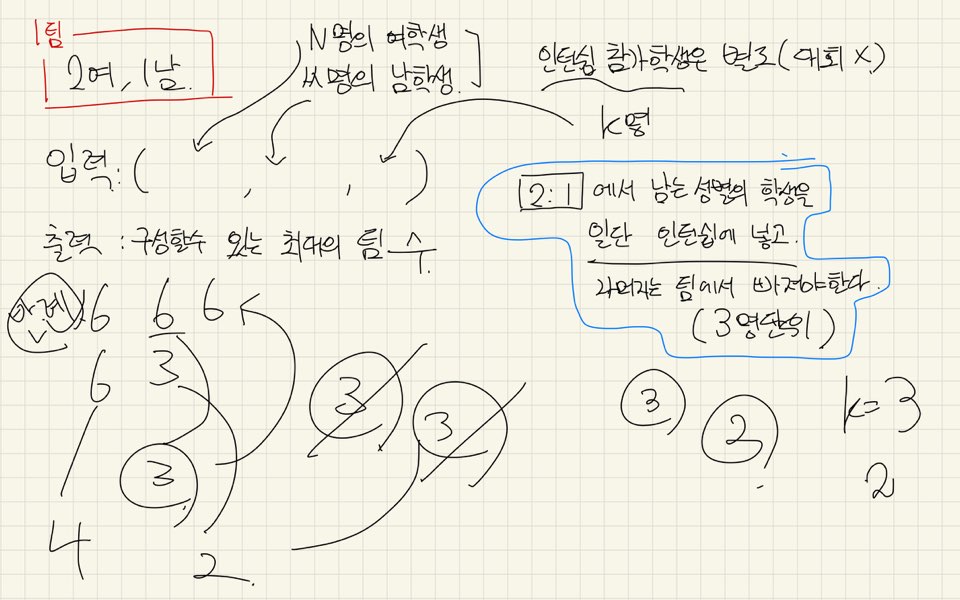문제 백준대학교에서는 대회에 나갈 때 2명의 여학생과 1명의 남학생이 팀을 결성해서 나가는 것이 원칙이다. (왜인지는 총장님께 여쭈어보는 것이 좋겠다.) 백준대학교는 뛰어난 인재들이 많아 올해에도 N명의 여학생과 M명의 남학생이 팀원을 찾고 있다. 그런데 올해에는 대회에 참여하려는 학생들 중 K명을 반드시 인턴쉽 프로그램에 참여하라는 학교의 방침이 생기게 되었다. 인턴쉽에 참여하는 학생은 대회에 참여하지 못한다. 백준대학교에서는 뛰어난 인재들이 많기 때문