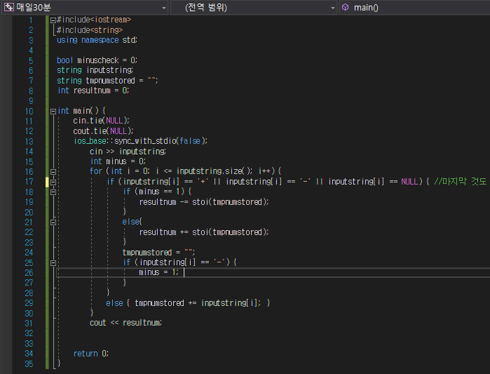 - 구현을 할 때 -가 처음나오면 check를 하고 tmp로 다음 연산부호가 오기전에 더해주고(string 즉 한글자씩이므로)