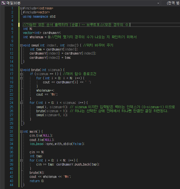 - 을 한 이후 사이즈를 하나줄인 함수로 다시 들어갑니다 (즉 하나의 카드는 선택해서 뺴놓는 느낌)
