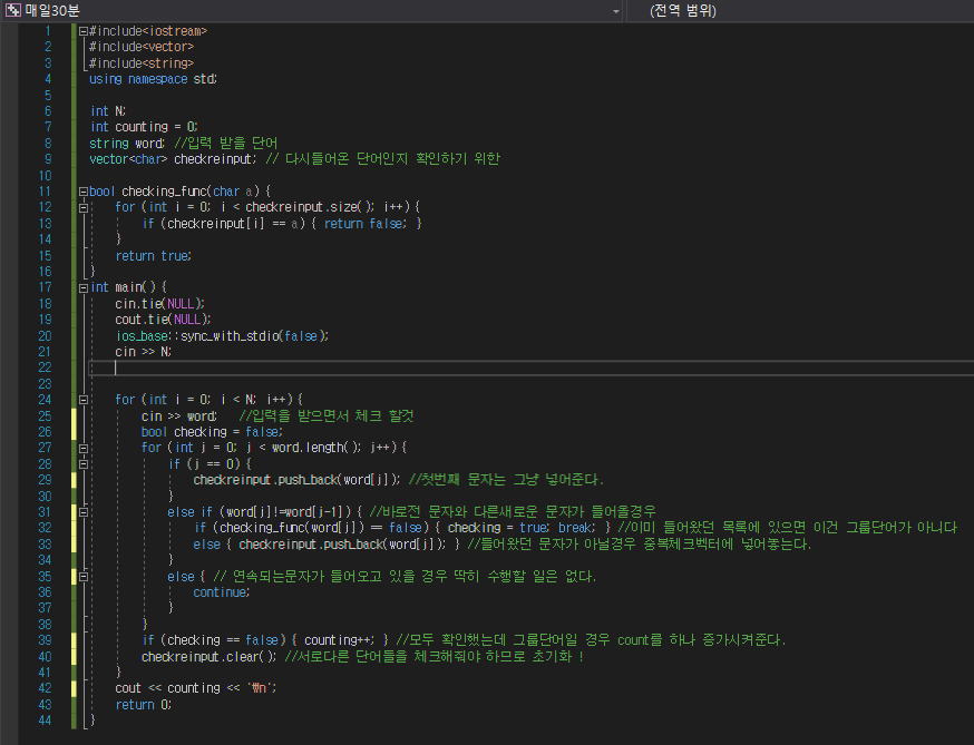 그룹 단어란 단어에 존재하는 모든 문자에 대해서, 각 문자가 연속해서 나타나는 경우만을 말한다. 예를 들면, ccazzzzbb는 c, a, z, b가 모두 연속해서 나타나고, kin도 k, i, n이 연속해서 나타나기 때문에 그룹 단어이지만, aabbbccb는 b가 떨어져서 나타나기 때문에 그룹 단어가 아니다. 단어 N개를 입력으로 받아 그룹 단어의 개수를 출력하는 프로그램을 작성하시오.