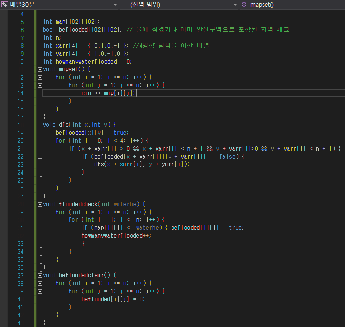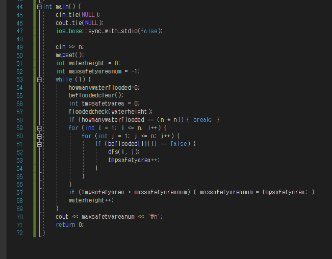 dfs를 돌려 침수영역을 구하고 기존의 최대 침수 지역을 넘는 수 라면 그 수를 최대침수지역에 넣습니다.