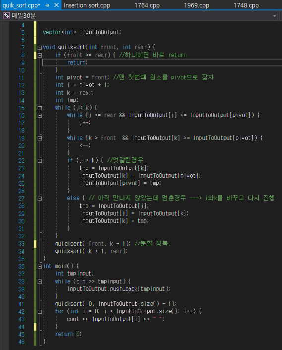 - partion을 한번 하면 pivot은 자신의 위치를 찾는데 그 자리가 최종 출력 위치이다.