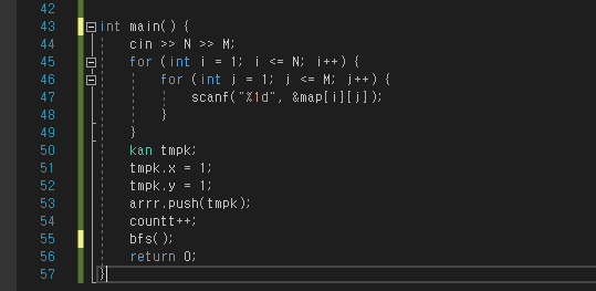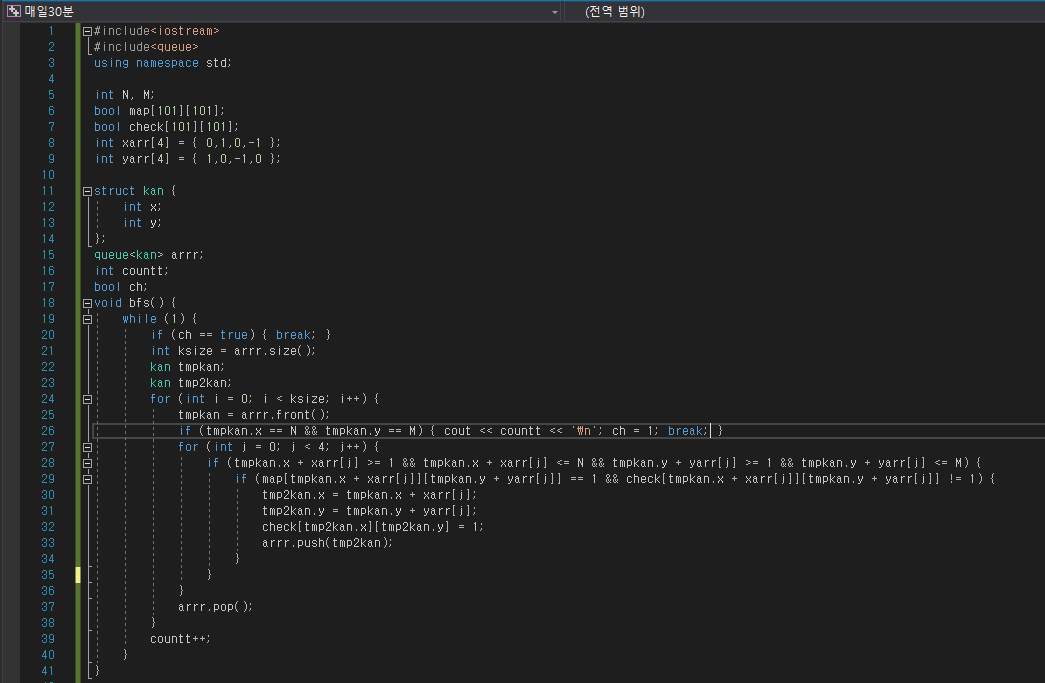 첫째 줄에 두 정수 N, M(2 ≤ N, M ≤ 100)이 주어진다. 다음 N개의 줄에는 M개의 정수로 미로가 주어진다. 각각의 수들은 붙어서 입력으로 주어진다.