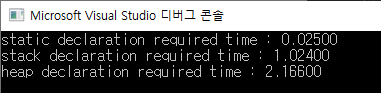정적영역에 선언 < 스택영역에 선언 < 힙영역에 선언