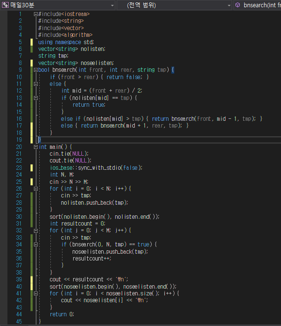 첫째 줄에 듣도 못한 사람의 수 N, 보도 못한 사람의 수 M이 주어진다. 이어서 둘째 줄부터 N개의 줄에 걸쳐 듣도 못한 사람의 이름과, N+2째 줄부터 보도 못한 사람의 이름이 순서대로 주어진다. 이름은 띄어쓰기 없이 영어 소문자로만 이루어지며, 그 길이는 20 이하이다. N, M은 500,000 이하의 자연수이다.