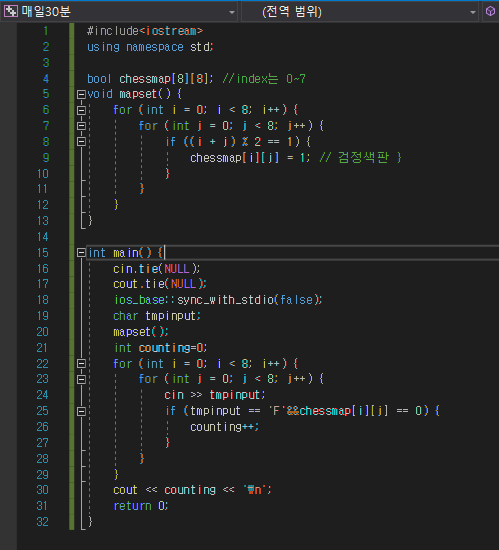 - chess 맵을 만들어주고 (흰색 ,검은색) i+j가 홀수 이냐? 짝수 이냐? 로 나누시면 됩니다.