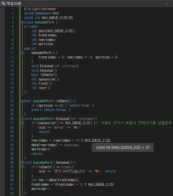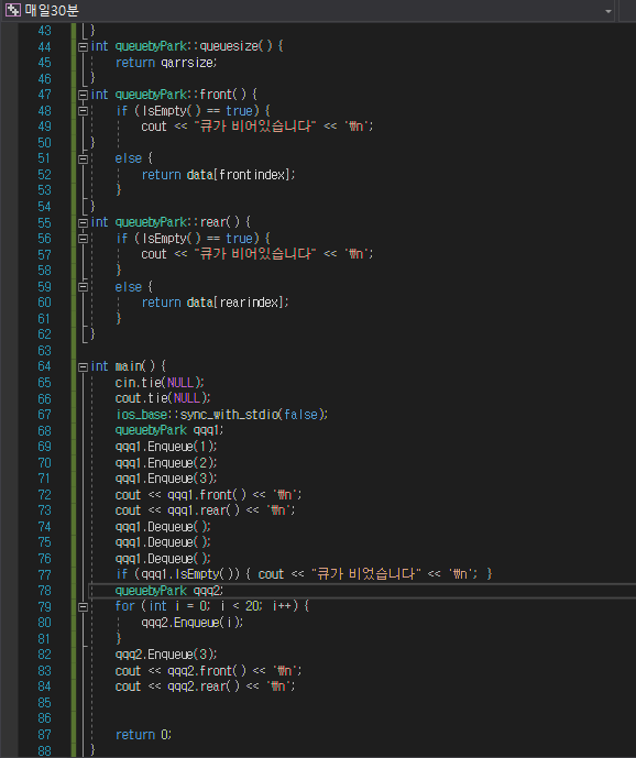 그 외 front(), rear(), peek() 등의 연산들은 index를 관리해줄 경우 모두 O(1) 타임 이겠죠?